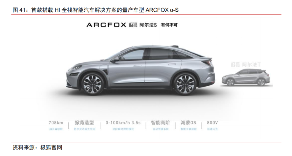 HI 全站智能汽车解决方案首次用于北汽极狐阿尔法 S 中,预计 2021 年交付。2021 年 4 月 17 日,北汽蓝谷发布与华为合作的第二款车型极狐阿尔法 S,成为 全球首款搭载华为智能汽车解决方案的量产车型。该车型共包括六个配置,售价 25.19-42.99 万元,其中最后两个配置搭载华为 Hi 全栈式智能汽车解决方案,售 价分别为 38.89 万和 42.99 万元。