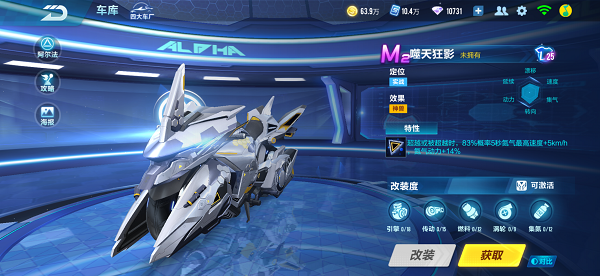 从六维性能图来看,噬天狂影各项属性均非常优秀,其中速度和转向能力极其突出,搭配实用的赛车特性,是赛道上的弑天神驹,生人勿近。