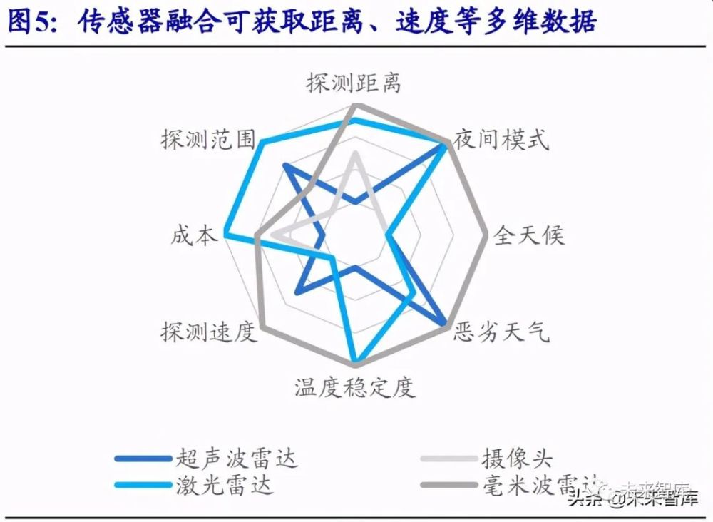 单一传感器难以满足智能驾驶全场景需要,多传感器融合方案成为主流。车载传感 器是感知环节的重要组成部分,主要包括车载摄像头、激光雷达、毫米波雷达、超声 波雷达等。其中,车载摄像头成像清晰,成本低,但探测距离短,对环境光照要求较 高,识别稳定性欠佳。毫米波雷达通过测量回波的时间差算出距离,其优势有探测性 能稳定、作用距离长、可穿透烟、雾等,具有全天候、全天时的特点,但受分辨率限 制,难以分辨近距离物体,无法识别行人。超声波雷达测距方式与毫米波雷达相似, 区别于应用波为超声波,其在短距离测距中具有显著优势,成本较低,但短于长距离 测量,且易受天气影响,仅在泊车系统中的应用较为广泛。激光雷达精度较高,探测 距离远,可在夜间使用,但目前仍在存在成本较高、在雾霾和雨雪等恶劣天气下探测 受限等问题。单一的车载传感器难以同时保障探测精度、距离,且无法摆脱对环境的 依赖,因此,多传感器融合已成为主流趋势。该方案在车身四周及顶部配置多类传感 器,可有效保证传感器工作实时性及稳定性,大幅提升探测精度与距离。