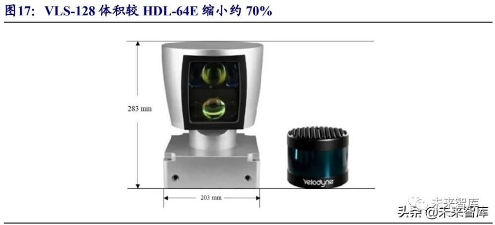 机械式激光雷达生产成本居高不下、寿命较短,难以面向前装量产。机械式激光雷 达的激光发射部件在竖直方向上排布成激光光源线阵,并通过透镜在竖直面内产生 不同指向的激光光束;在电机的驱动下持续旋转,达到 3D 扫描的效果。机械式激光 雷达是最早应用于智能驾驶的激光雷达产品。Velodyne 是生产机械式激光雷达的代 表企业,其旗下产品包括 32 线激光雷达 HDL-32E、64 线激光雷达 HDL-64E 等。近期推出的 128 线激光雷达 VLS-128 相比于 HDL-32E 尺寸缩小 70%,探测距离增 大 1 倍,分辨率提高 4 倍;从技术性能来看,VLS-128 在探测距离和分辨率上已超 越市场上现有产品。尽管如此,由于机械式激光雷达内部结构精密,零件数多、组装 工艺复杂、制造周期长,生产成本始终居高不下。此外,据亿欧咨询,机械式传感器 平均失效时间为 1000 小时至 3000 小时,而汽车厂商的要求则是至少 13000 小时。因此,机械式激光雷达难以面向前装量产。