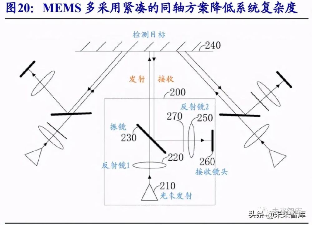 MEMS 激光雷达通过硅基 MEMS 微振镜改变单个发射器的发射角度并由此形成面阵的扫描视野。与传统的金属机械结构部件相比,MEMS 方案可有效解决机械式激 光雷达因内部旋转模块体积和重量较大,在惯性冲击下损耗零部件的痛点。然而, MEMS 在技术上存在缺陷。由于离轴方案需要采用 APD 阵列做接收,在成本端造成 压力的同时也增加了系统的复杂程度。目前市面上硅基 MEMS 激光雷达大多采用结 构紧凑的同轴方案,对其材料的耐用性产生巨大挑战。MEMS 的内部是小尺寸的悬 臂梁结构——反射镜悬浮在前后左右各一对扭杆之间以一定谐波频率振荡,达到反 射激光器光线的目的。然而在实际工作中,两对扭杆同时对微振镜进行反向扭动,在 外界的振动或者冲击下快慢轴极易断裂,其使用寿命大多在几个月内。受限于此, MEMS 激光雷达过车规的难度明显提升。