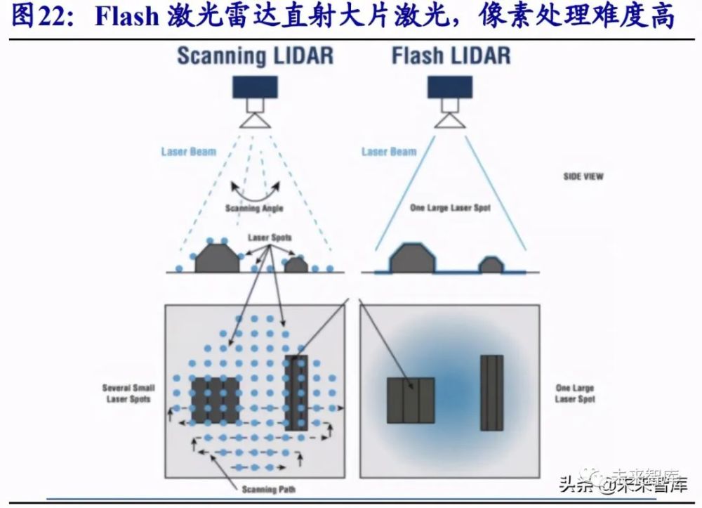 (1)Flash 激光雷达:原理是快闪,其在短时间直接发射出大片 覆盖探测区域的激光,再以高度灵敏接收器完成对环境周围图像的绘制。Flash 需要 处理海量像素,易受干扰,会损失一部分的探测精度,远程探测难度较高。此外,由 于 Flash 激光雷达需要一整个面而非小的窗口进行接收,在此过程中会引入较多环境 光噪声,信噪比较差。