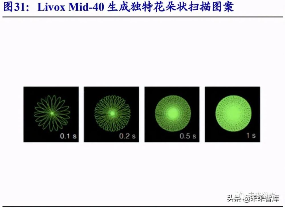 无人机龙头厂商大疆孵化览沃科技(Livox)入局激光雷达,非重复扫描方式叠加棱 镜方案有效降本。大疆于 2016 年成立览沃科技,经过三年潜心研发,2019 年起开始 对外发布产品,目前共有 Mid、Horizon 和 Tele 三个系列产品,并于 2021 年与小鹏 合作,为其定制打造了车规级激光雷达 Livox HAP。大疆采用棱镜式扫描方案,利用 电机带动一边薄一边厚的透明玻璃进行旋转,实现扫描。这与 MEMS 微振镜方案及 转镜式方案形成显著差异,后两者均采用了厚度均匀的薄反光镜,围绕悬梁臂或转 轴旋转。而在棱镜式方案下,激光光线发射后会在一边薄一边厚的透明玻璃上发生 偏折,从而在较少的模组拼接内实现更大的 FOV,进而提升点云在高温、振动等恶 劣环境下的稳定性与可靠性,降低分层、错位等问题。此外,棱镜方案亦是大疆激光 雷达降本的关键,该方案有效减少了收发单元的数量,相应降低成本以实现一帧之 内更高的线数。据大疆及九章智驾,HAP 的激光发射器和接收器仅有 6 个,高速旋 转的棱镜通过折射,最中间 ROI 区域可形成“等效 144 线”的效果。此外,大疆还 研发了非重复扫描方式以提升扫描效率,在 FOV 范围内,激光束每一帧的扫描曲线 都会发生微小的偏移,从而实现在 FOV 范围内扫描多次。其扫描的区域面积会随着 时间增大,达到近 100%的视场覆盖率,在同等价位下领先于行业其他产品。
