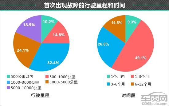 在这些出现非人为故障的车辆中,首次故障出现在行驶里程500公里以内的占比为10.2%;行驶里程1000-3000公里出现故障的的车辆占比最高,为32.4%。而对于首次出现故障时间段的调查结果显示,有9.3%的车主表示车辆在购车1个月内便出现了故障,另有49.1%的车辆首次故障出现在购车1-3个月。