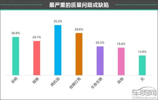 在对车主的进一步调查中我们发现,发动机和变速箱出现非人为故障的占比最高,这一点也体现在“这款车最严重的质量问题或缺陷”调查结果中。经调查发现,车主对于奥迪Q2L “烧机油”、“故障灯亮”方面的问题抱怨最多,占比分别为35.2%和29.6%,均与发动机有关。此外,还有26.9%和24.1%的车主反馈奥迪Q2L存在各类“异响”和“顿挫”问题。