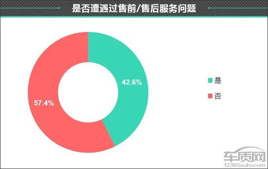 在本次针对奥迪Q2L售前/售后服务的调查中,有93位车主的保养渠道选择了“授权4S店”,占比约为86.1%,其余车主则选择了“其他”。此外,在接到的108份问卷中,有46份问卷显示车主遭遇过售前/售后服务方面的问题,占比约为42.6%。