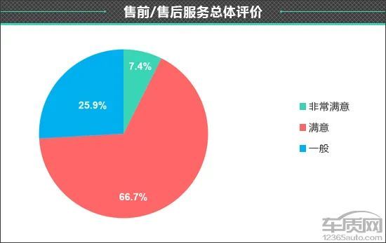 不过,在售前/售后服务总体评价中,接受调查的车主还是给出了相对客观的评价,其中认为“非常满意”的车主占比为7.4%,认为“满意”的车主占比为66.7%,另有25.9%的车主表示 “一般”,无“不满意”评价。