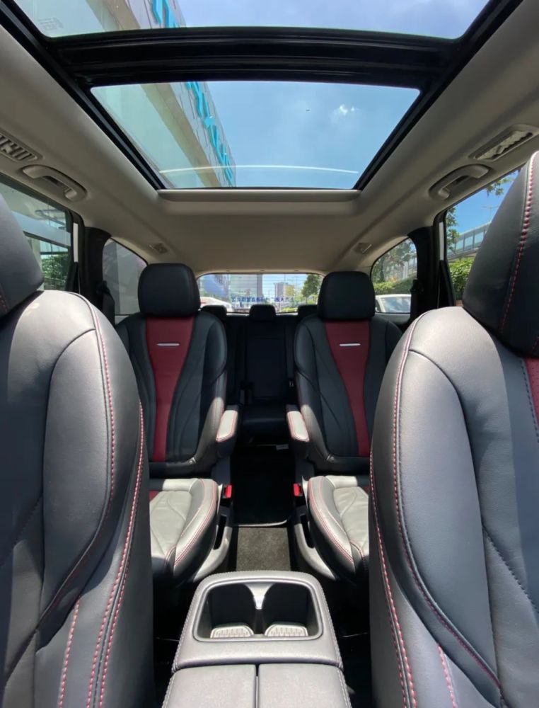 留下之前试驾的客人的位置不作调整,1米78的小编坐在第二排的独立座椅,膝盖距离前排还有一整个手掌的距离,打开全景天窗后有更强的空间感。