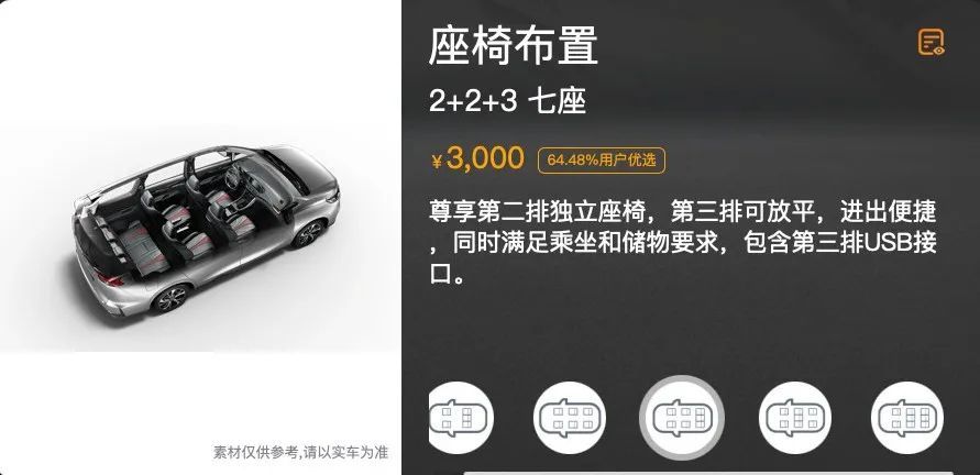 定制的第一步:座位。在五座的基础上,用户可以选配“2+2+2”六座、“2+2+3”或“2+3+2”七座,甚至提供载客能力最大化的“2+3+3”八座布局(节假日高速不免费),各加3000元;