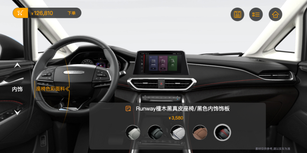 第三步:内饰,包括座椅的面料/色彩和中控饰板的颜色。素车上为灰色织物座椅+灰色中控饰板,增加1490元将座椅升级为皮质,同时提供黑、灰、棕3种颜色搭配(座椅和中控饰板颜色一致),增加3580元更可升级为黑色真皮座椅;