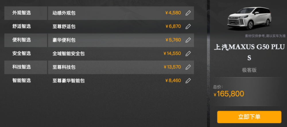 定制流程中的前四步都属于比较常规的选配,蜘蛛智选系统的精髓在最后一步。包括外观、舒适、便利、安全、智能、科技等方面的选装包,由于内容比较多,有兴趣的可以到上汽大通的官网定制一番。