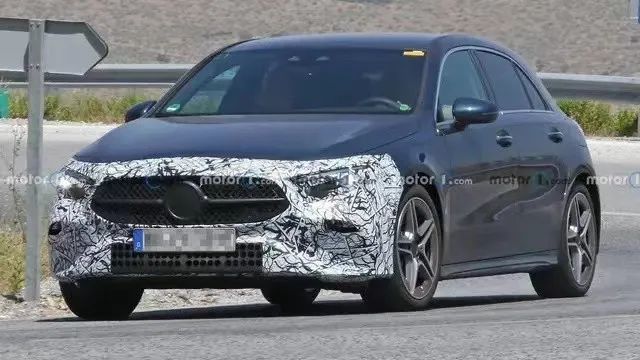 从谍照图的正面,我们可以看到,全新奔驰A级整体车身的设计还是延续了现款车型,整体没有大的改动,不过它在前车头大灯的形状上做了改进,并且在中网的设计上,它取消了现款车型那种密集点阵式的星辉设计,采用了网状式与栅栏式的设计,显得更加的大气了,另外,轮毂方面,它也做了调整,采用了极为前卫的海星式轮毂!