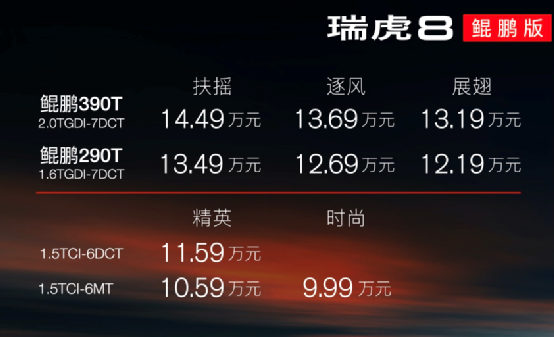 趁此势头,奇瑞汽车于7月17日将瑞虎8鲲鹏版正式上市,新车共推出9款车型,官方售价9.99万元-14.49万元。