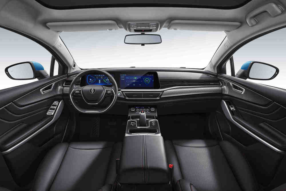 内饰设计方面,首先采用了全黑色色调,给人一种酷酷的感觉,其次纯电动车和科技感是孪生兄弟,自然会下一番功夫,由全液晶仪表+大尺寸中控液晶屏组成的一体式贯穿式设计,是视觉的中心。还有双幅式方向盘、游艇档把,以及触控式的功能键,再加上红色的安全带,运动气息很浓。