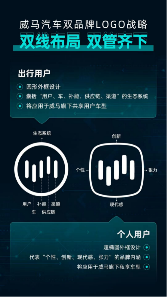 此外,威马公布了双LOGO战略,其中有圆形的LOGO将代表出行用户产品;全新超椭圆标识将代表个人用户产品,如W世界系列SUV和M大师系列轿车。