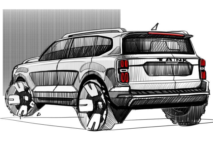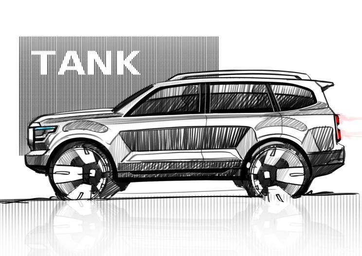 从此前坦克官方公布的设计草图看,整车走硬朗风格,而这也很符合坦克品牌的调性。当然,和坦克300的区别还是比较明显的。大尺寸格栅、宽厚的保险杠、肌肉感的营造等等,一看就知道是个狠货色。不过从先前的曝光的实车图看,与设计草图的效果还有些差距,所以还请以实车为准~