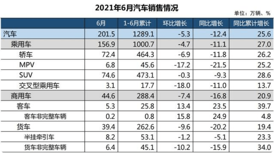 1-6月,整车产销1256.9万辆和1289.1万辆,同比增24.2%和25.6%。但是,6月产销环比下降4.8%和5.3%(由于去年特殊,这里同比数据意义不大)。5月份芯片交货周期已经达18周,比3月份的状况更加恶化,问题反映到6月份产能上。这和供应链声称下半年情况将缓解的“安抚”截然相反。7月份大概率将继续下降。