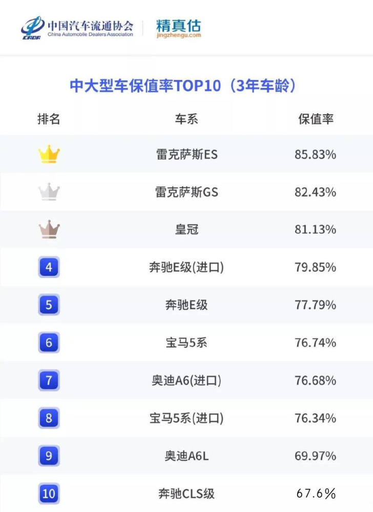 再看中型车市场,几乎被豪华品牌吃干抹净,BBA占了7个名额,雷克萨斯也有一款IS上榜,剩下的两个席位则分别属于丰田凯美瑞与本田雅阁,保值率分别达到78.55%77.18%,这两款车型共通点倒也不少,市场销量非常高,优惠力度小,并且有着口口相似的好口碑以及出色品质,在二手车市场基本不愁出手。