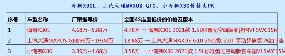 上述分享给大家的这些MPV车型中,其中指导价最低的MPV是小海狮X30,接着是海狮X30L,价格相对较高的是上汽大通MAXUS G10,它们的价格是3.39万、4.68万以及13.98万。值得我们关注的是,许多情况下厂商指导价会和4S成交价的价格差还是蛮大的。据悉,海狮X30L、上汽大通MAXUS G10、小海狮X30的国内最低的落地价为4.78万、13.68万以及3.58万。不知道上述介绍的这些MPV有哪款是你最青睐的呢?最后衷心祝愿亲爱的你们好事成双、一本万利。