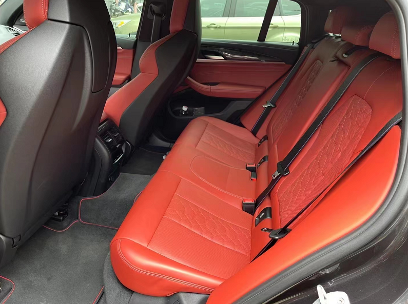 说实在的,这辆宝马X4 M的后排并没有太多的优点可言,不过颜色配饰倒是很漂亮,大红色的内饰夹杂着黑色的面板,颜值不错,但是乘坐的舒适度不高,人体倾斜角度比较大,有一点内陷的感觉。