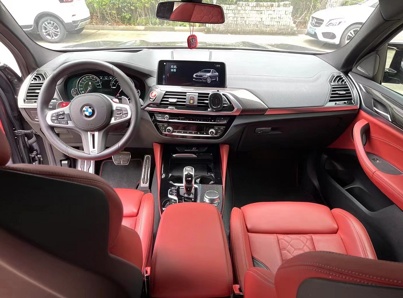 这辆宝马X4 M的内部采用的是大红色加碳纤维饰板的装饰,运动感点缀得相当的出色。我们常见的宝马元素当然也恰到好处地出现了,但是也经过了一些修饰,比如一键启动变成了红色的按钮,和内饰的红色进行匹配,不但运动,而且一体化相当的到位。此外,银色的换挡拨片也变得更长,更加的锋利了。座椅采用的是赛车样式的设计,而且更具运动感,两侧的包边护翼都更贴合身体,安全系数较高,但是座椅材质比较硬。