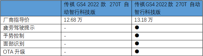 接下来是自动智行科技版,它的售价是12.68万元,比上一个配置又贵了7000元。不过增配了前/后排头部气囊、车道偏离预警、车道保持辅助、主动刹车、自适应巡航、360度全景影像、车载微信、远程启动、皮质方向盘、12.3英寸液晶仪表、主驾座椅电动调节及加热、卫星导航、语音控制、车联网、自动大灯、自动雨刷等一系列安全、科技上的配置。不难看出只有从自动智行科技版开始新款的传祺GS才算得上是一款智能汽车。