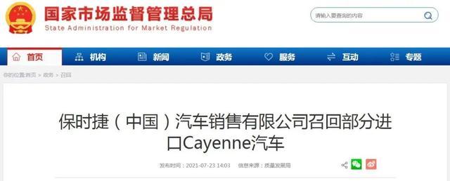 日前,保时捷(中国)汽车销售有限公司根据《缺陷汽车产品召回管理条例》和《缺陷汽产品召回管理条例实施办法》的要求,向国家市场监督管理总局备案了召回计划。将自2021年8月16日起,召回2017年12月5日至2021年2月10日期间生产的部分进口2018-2021款Cayenne系列汽车,共计94辆。