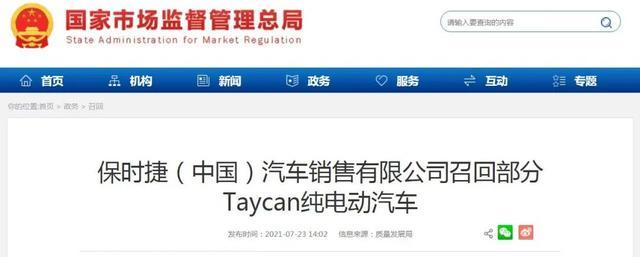 保时捷(中国)汽车销售有限公司召回部分Taycan纯电动汽车