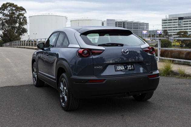MX-30 Astina 骑在 18 英寸合金上,具有三种油漆颜色(至少在我们的测试仪中),提供分层的侧视图和带框架的温室。车辆前后视图可识别马自达,两端均装有 LED 灯。
