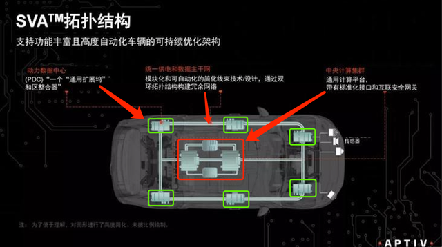 安波福的SVA域架构(各区域绿色的6个域控制器+中间的中央控制器)