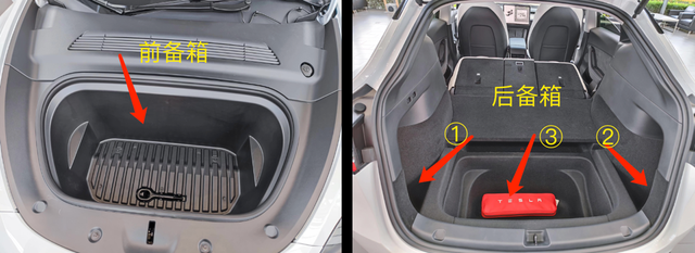 Model Y前备箱+后备箱,其中&为后背箱两侧储物槽,为后备箱下一较大的暗储物箱