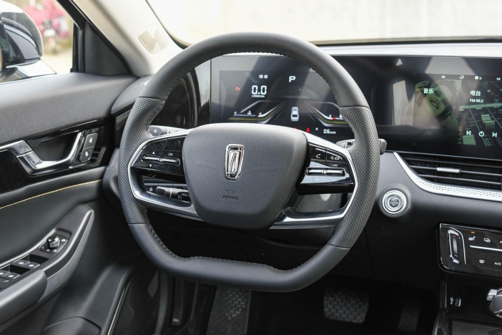 方向盘使用的是平底式设计,盘身直径和握感也是我喜欢的类型,三九点位置还加入了打孔真皮覆盖,能有效增加透气性。多功能按键为物理样式,手感不错,但镜面烤漆容易沾染指纹,需要多加清洁。