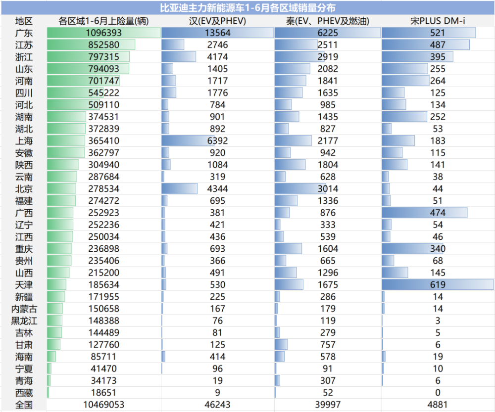 至于主攻10-20万元区间的秦系列,虽然广东省依然是领跑地位,但其在全国其它区域的销量分布明显均衡了很多,北上广江浙依然是Top 5,但五大市场在全国的占比只有四成多一点,和采用增程式的理想ONE更为接近。