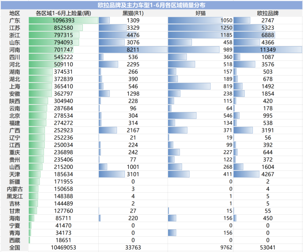 这种背景下,欧拉品牌的区域销量分布接近宏光MINIEV,也在情理之中了: