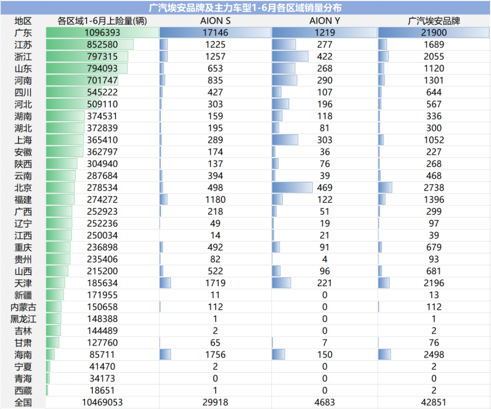 上半年接近4.3万辆的整体销量中,广东省贡献了近2.2万辆,占比超过了50%,至于主销车型AION S,广东省销量占比更是达到了57.3%。我们不评价这款车具体的销售流向和客户群体,单单如此高的单一市场依赖度,对未来发展绝对不是件好事,北汽新能源就是先例。