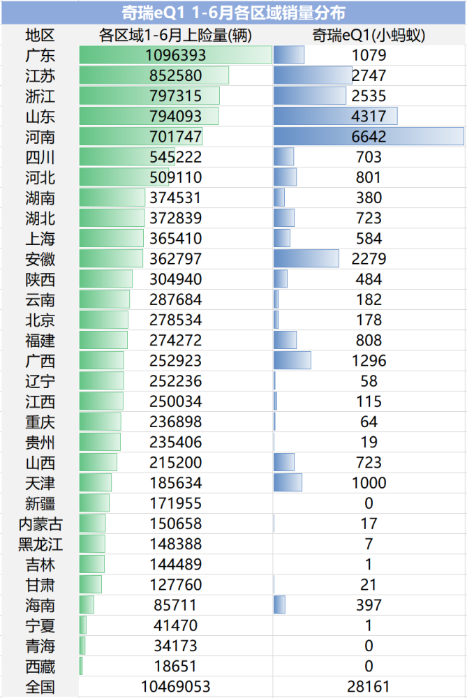 奇瑞在新能源市场的整体发展并不突出,但在每个月的销量榜上,号称“小蚂蚁”的奇瑞eQ1,排名通常都比较靠前。这款车的定位和欧拉黑猫相近,所以在区域销量分布上,两款车也比较相似: