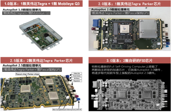 特斯拉的Autopilot在不断进化,其芯片已经经过3次迭代。最早的1.0数据处理单元包括1颗英伟达Tegra和1颗Mobileye Q3;Autopilot2.0抛弃了Mobileye芯片,采用1颗英伟达Tegra Parker芯片和1颗Pascal架构GPU;2.5版本则多了1颗英伟达Tegra Parker芯片;特斯拉最新的Full Self-Driving Computer上搭载了两颗自主研发的加速芯片,它就是Autopilot3.0硬件,将逐步取代现款车型上装配的Autopilot2.5硬件。