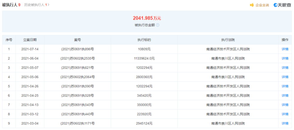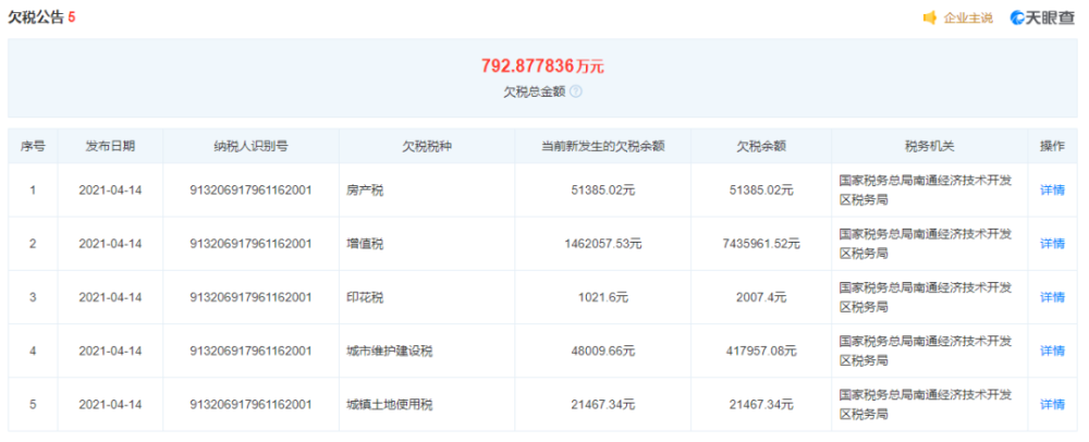 天眼查数据显示,南通鑫湖4S店在今年5月被法院列为限制高消费企业。从今年3月至7月仅仅四个月的时间里,南通鑫湖4S店9次成为被执行人,被执行总标的超过2041万元。此外,南通鑫湖4S店还总共欠税超过792万元。