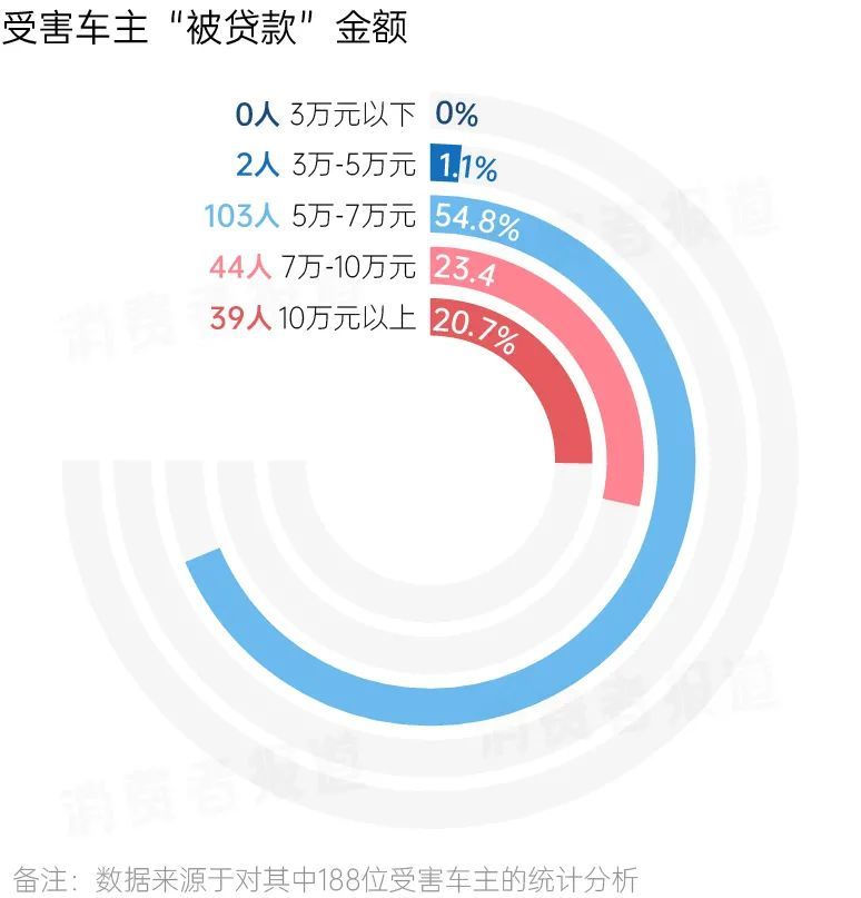 受害车主“被贷款”金额方面,贷款金额在5至7万元的人数达103人,占比近55%,金额在7至10万元的占比达到23.4%,金额在10万元以上的人数占比也达到20.7%。
