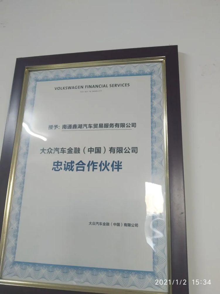 ▲南通鑫湖4S店被大众汽车金融(中国)有限公司授予“忠诚合作伙伴”称号