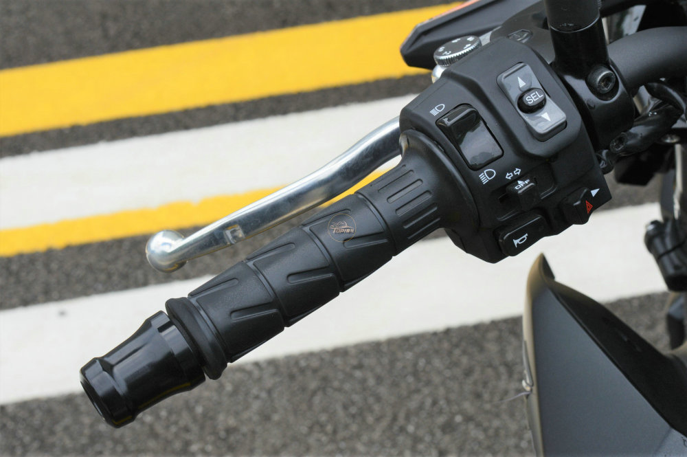 标配滑动离合器,左右牛角提供多角度调节功能,手把按键基本上是常规布局,只是在左手边多了一组调节仪表、功能设置的按键。