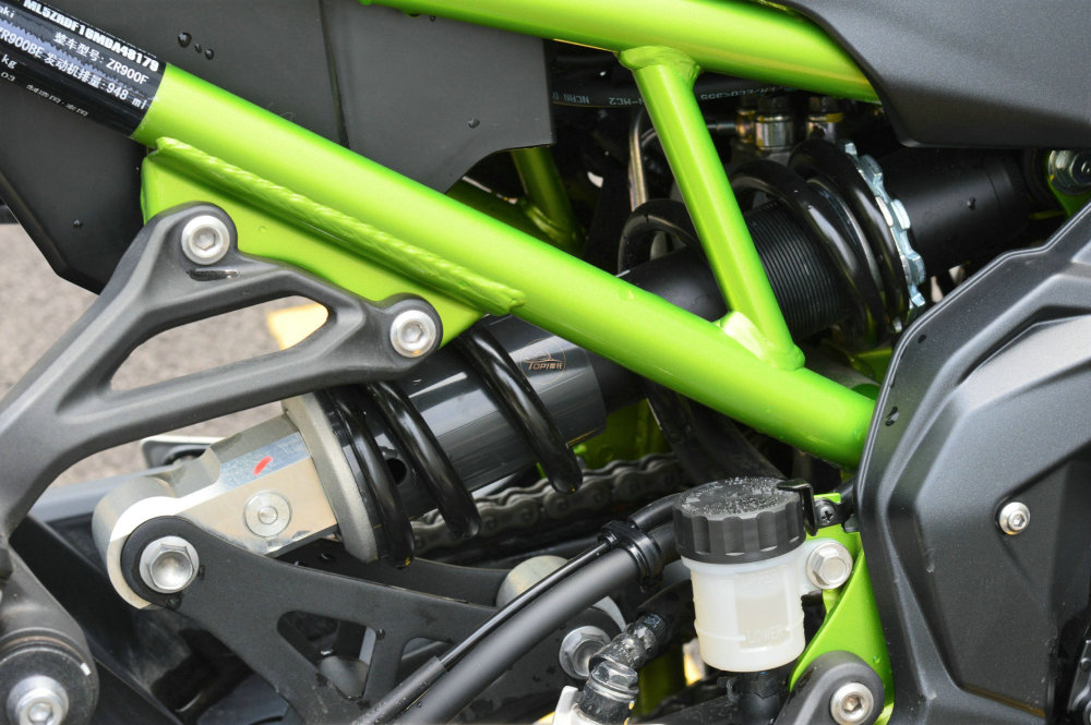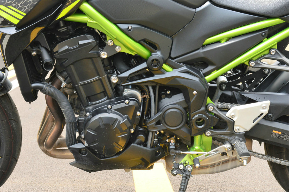 948cc排量的直列四缸水冷发动机,是川崎Z900的核心卖点。峰值马力86.3kw(117匹)/ 9,500 rpm,最大扭力95Nm/7700rpm,整整比同价位的本田CB650R高了30.3kw(41匹)。
