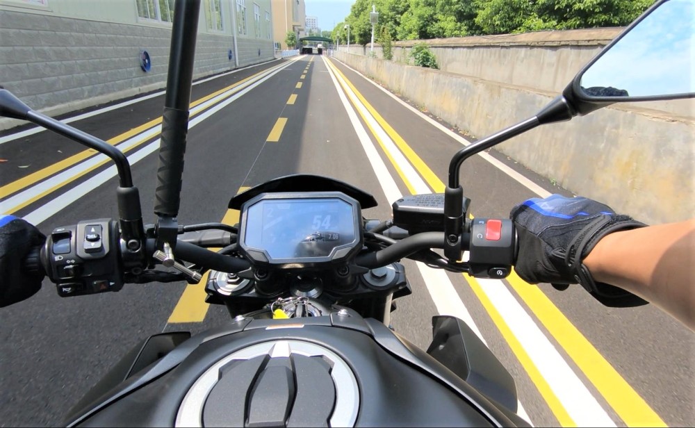 操控方面,因为车身短、轴距短,虽然整备重量达到了218kg,但是跑起来还是很灵活的,压弯绕桩基本不在话下,原厂配备的邓普禄Sportmax RoadSport 2轮胎,虽然在国内不是很主流,但是这套轮胎的抓地力还行。
