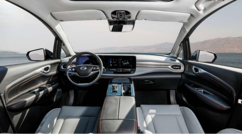 广汽埃安AION V的内饰同样也走简洁风格,中控台区域设计流畅,双12.3英寸的连体屏看起来具有一定的科技感。换挡机构被设置成了旋钮机构,并匹配大面积钢琴漆面板,虽然看上去比较高档,但特别容易脏,而且不知不觉容易变成指纹收集器。座椅仿皮材质,且基础款无智能互连系统,天窗也仅有有0.74㎡.