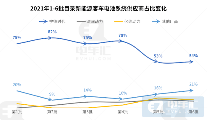 电车汇消息:在客车企业的电池配套中,宁德时代一直是处于绝对优势的地位,过去几年各批次的新能源汽车推荐目录中,搭载宁德时代电池的客车产品数量占比几乎都在70%以上,但从近两个月的数据来看,在电池系统领域,宁德时代的占比正在逐步下滑。