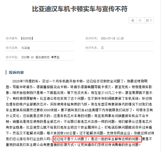 据汽车质量网站车质网显示,比亚迪汉EV被大量车主投诉车机卡顿,与宣传不符。