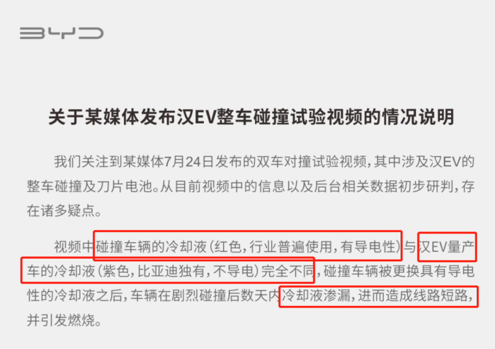 7月24日晚,“某媒体发布汉EV整车碰撞试验视频”。