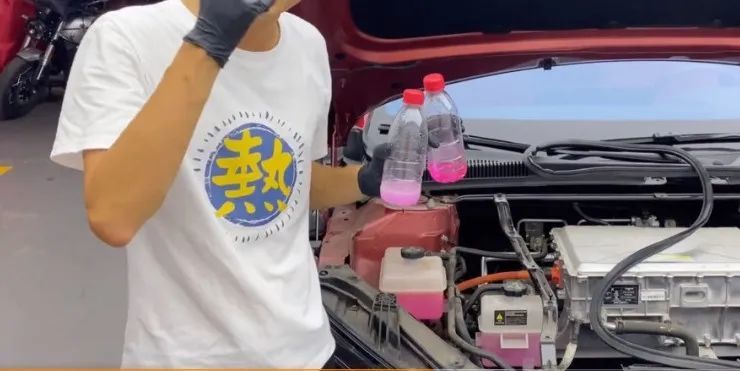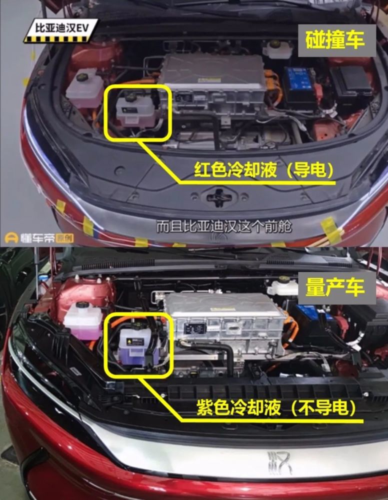 我们可以看到,视频截图中碰撞车的冷却液和比亚迪提供的“量产车”图片中的冷却液,呈现出明显不同的颜色,前者偏粉红,后者偏紫。