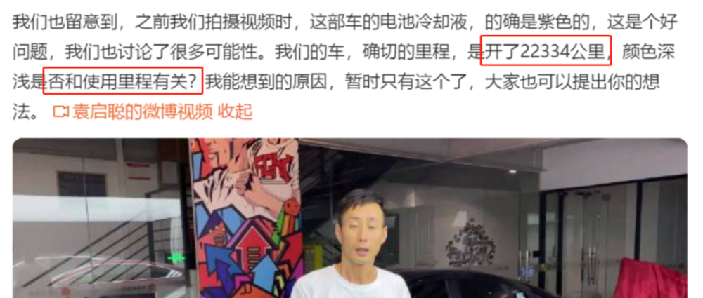 之后没多久,在网友的提醒下,袁老师发现,在之前用该车拍摄的视频中,电池冷却液的是比亚迪“量产车”图片中的偏紫色。