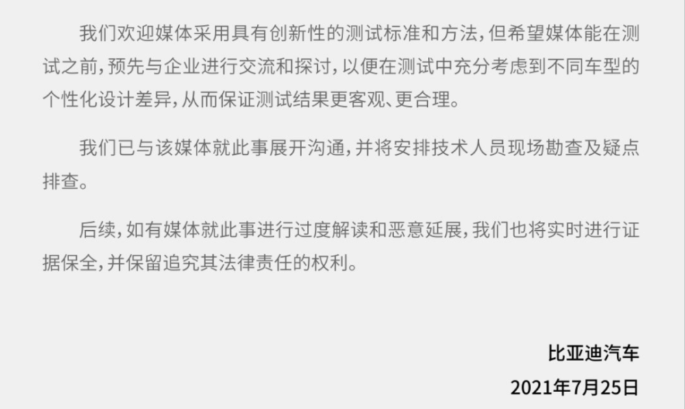 于是在7月25日13时43分,比亚迪汽车官方微博发布了针对上述视频的情况说明,“初步判断,存在诸多疑点”。